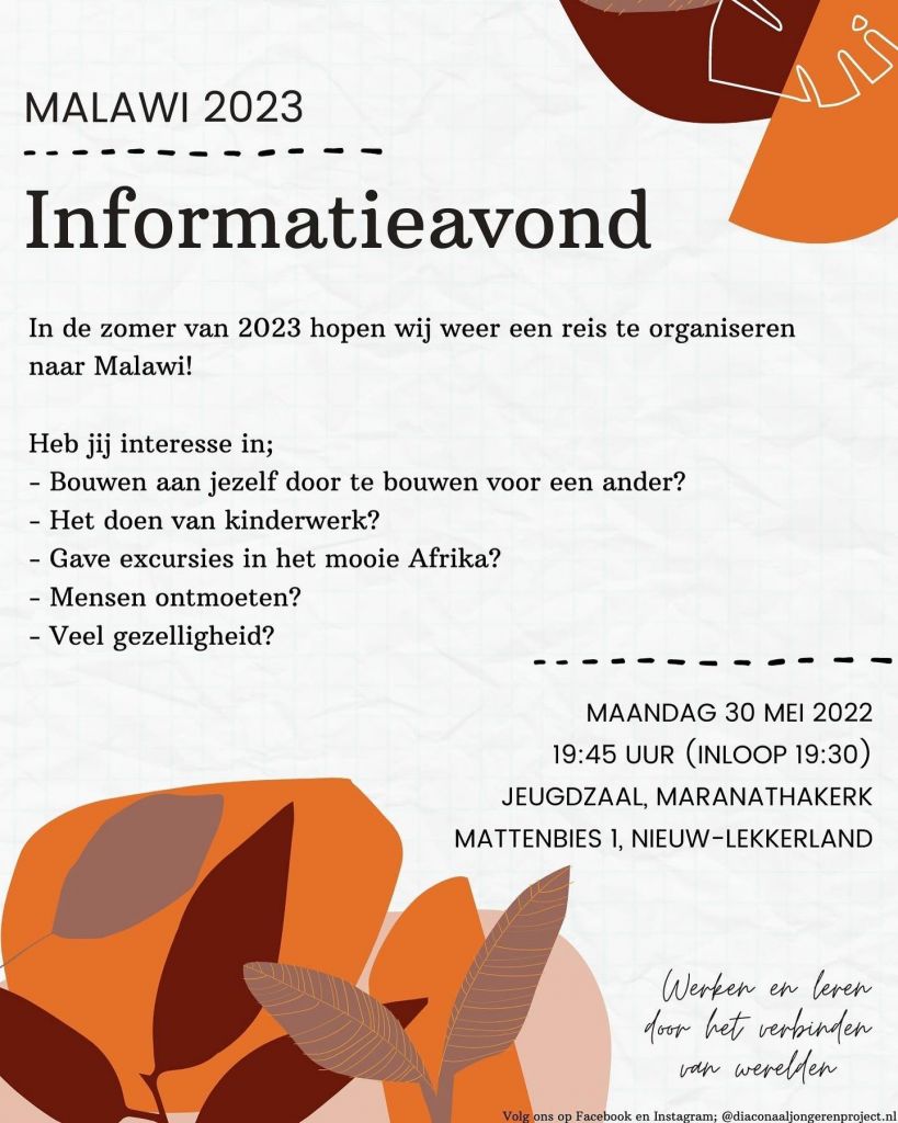 Vanuit het diaconaal jongeren project Nieuw-Lekkerland wordt gekeken om opnieuw een reis te organiseren naar Malawi. Lijkt het je interessant? Bezoek dan de informatieavond op maandag 30 mei 2022.